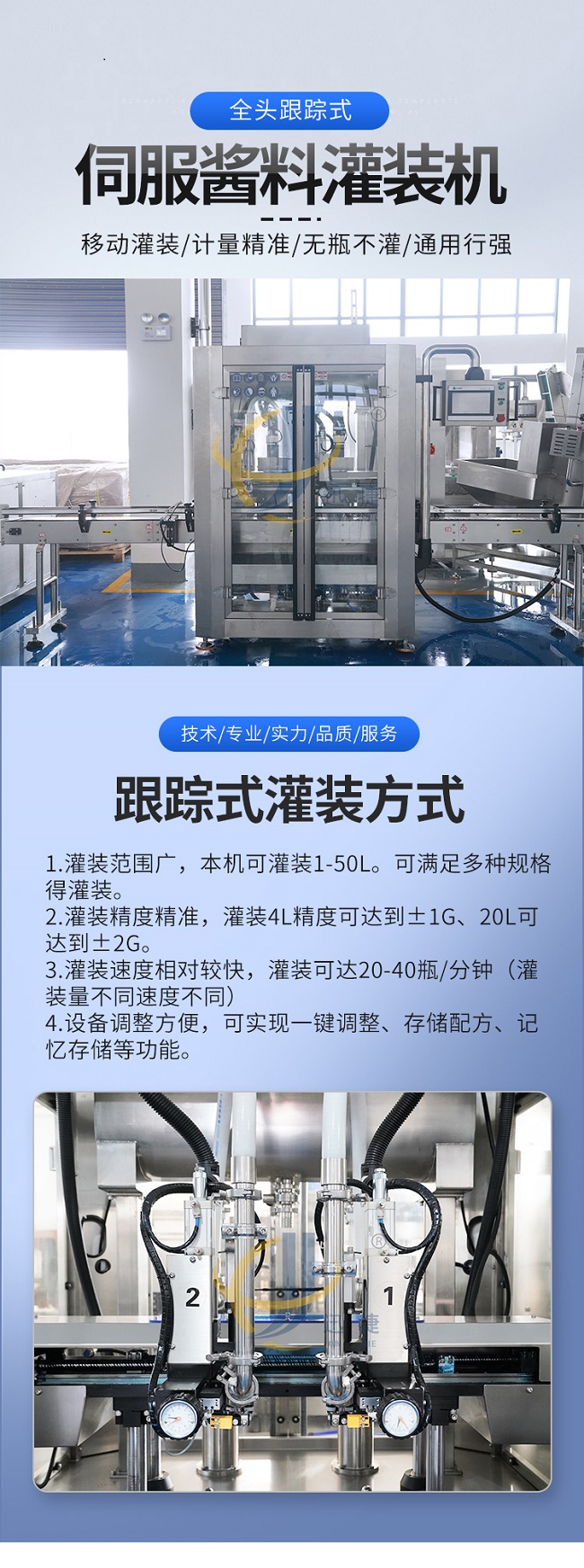 這款全自動跟蹤式醬料灌裝機是本公司研發的新款專為醬廠研發的生產設備,跟蹤式醬料灌裝機適用范圍:沙拉汁、調味汁、千島醬、番茄醬、胡椒醬、糖漿、蜂蜜、枇杷膏、辣椒醬、牛肉醬、洗手液、洗衣液等的灌裝。